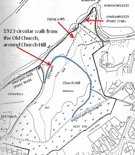 The popular coastal path around Church Hill and Wain’s Hill along with the section between Church Hill and the cemetery, together known as Poets’ Walk, was constructed in 1929 in conjunction with the creation of the Marine Lake.