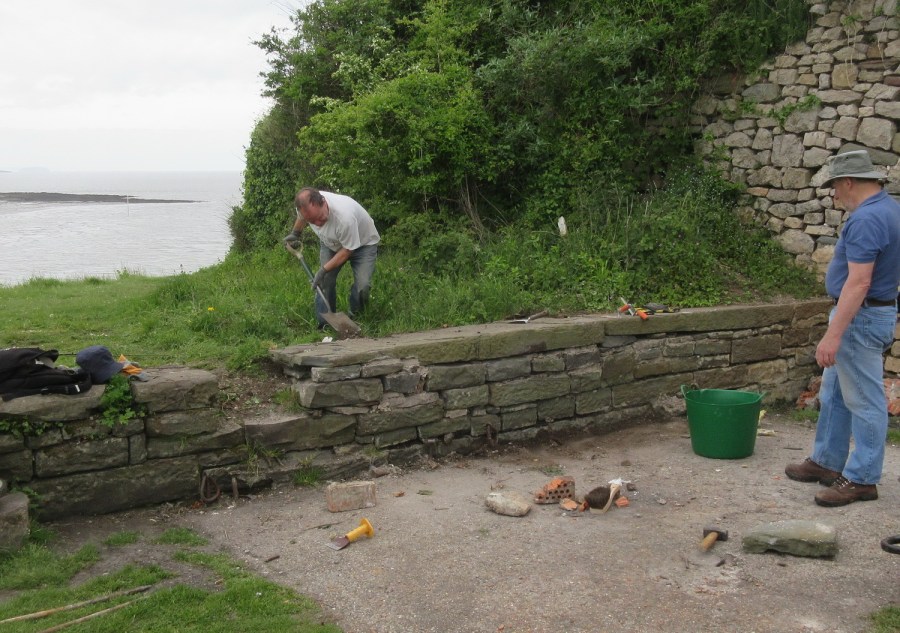 lower course of stones mortared in and 1st of 3 capping stones back in place