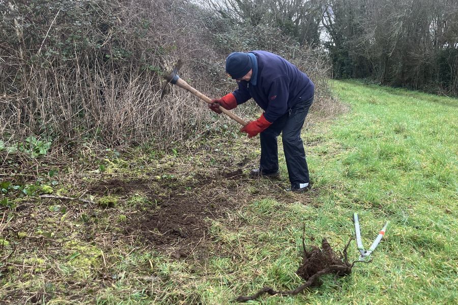 Scrub control on Church Hill – grubbing out roots of wild clematis to reduce its spread