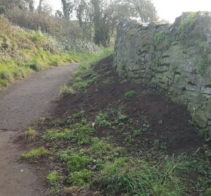 The rock face on the coastal path below the cemetery cleared of brambles and debris