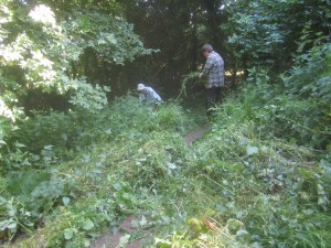 The path behind the cemetery allotments is cleared of brambles and other vegetation and access to the Wain’s Hill zigzag woodland path is improved by pulling nettles.