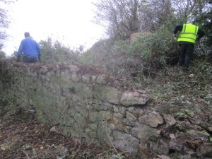 Invasive ivy and brambles are cleared from the rock face below St Andrew’s churchyard.