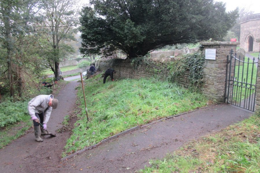weeding and tidying the green bank and path