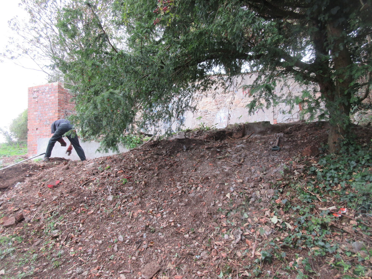 a concrete floor is discovered by digging while old brickwork with modern graffiti is removed