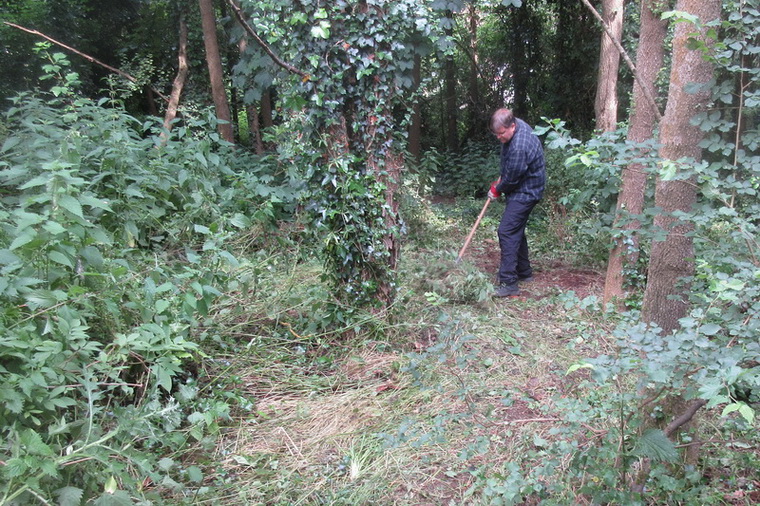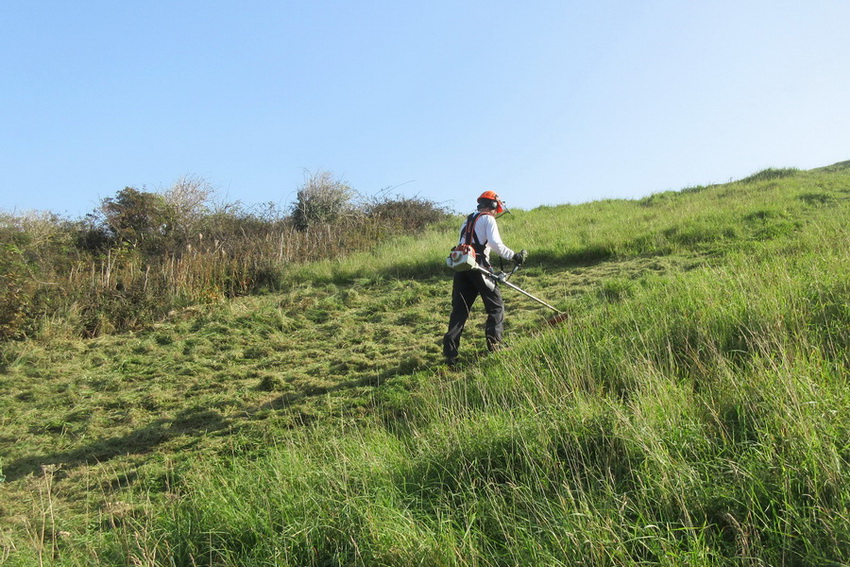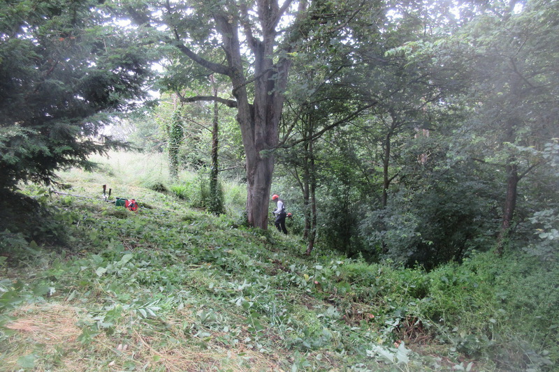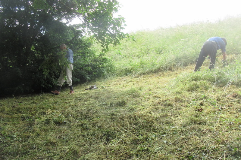 Mowing the 1923 path over Church Hill to encourage walkers to use this route. Brush-cutting invasive nettles and goosegrass on the shaded lower parts of Wain’s Hill rampart.