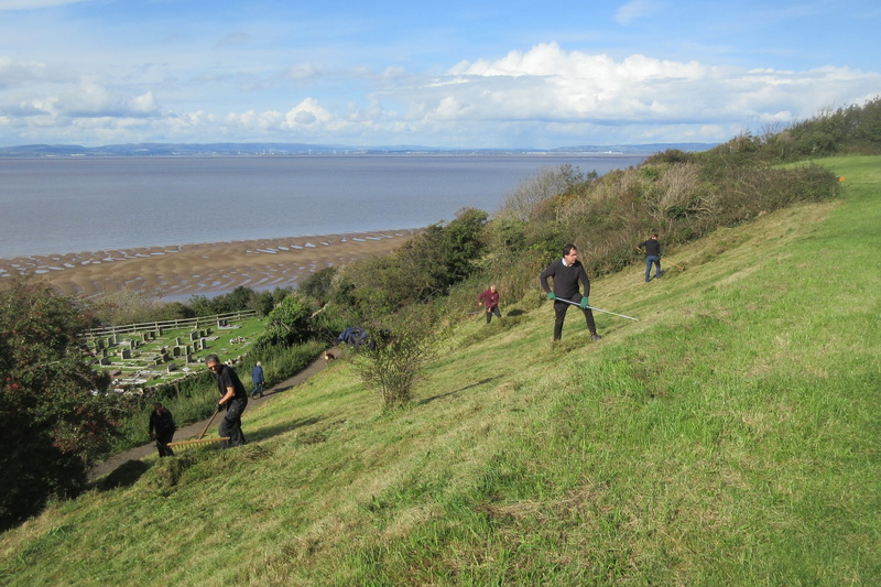 Church Hill above the Salthouse – a steep bank is scythed and raked while access is improved along two paths by cutting back encroaching brambles and pulling nettles.