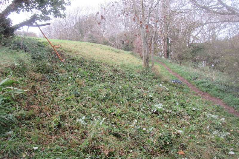 Wain’s Hill ramparts – grass recently cut by the contractor Green Mantle has been left as a long row and needs to be raked off the slope into the woodland to create habitat piles.