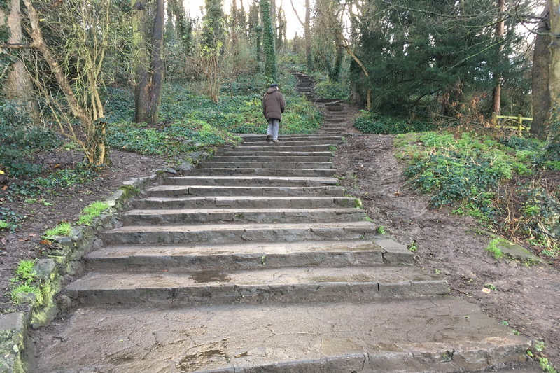 Returning to work after the second Covid 19 lockdown, volunteers clear accumulated mud and autumn leaves from the approach path to Wain’s Hill as well as from steps and all the formal paths near Marine Lake, to benefit crowds of Christmas visitors.