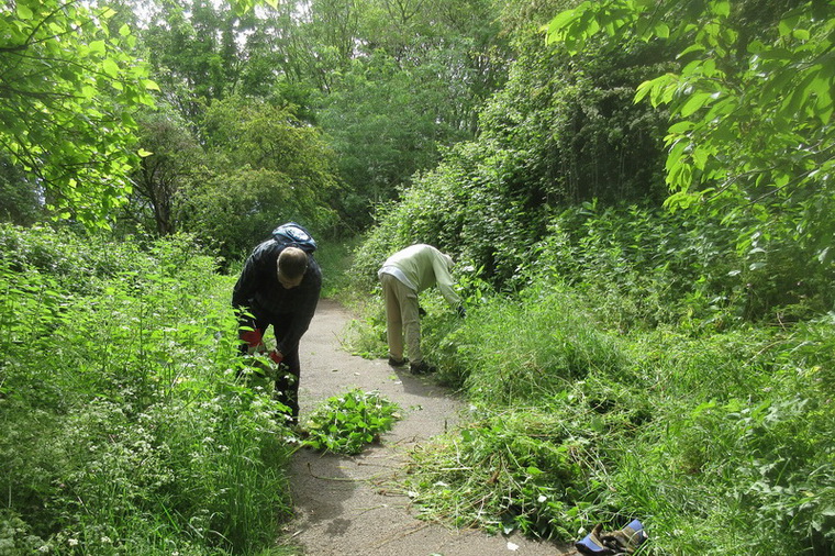 After flowering, the popular wild damson ‘arch’ on the south side of Church Hill is trimmed and the path edges tidied, while nettles are pulled and wild radish grubbed beside the path.