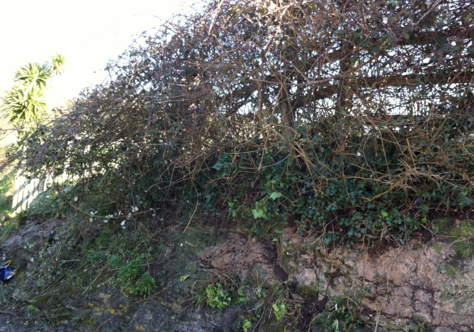 Invasive bramble and ivy need to be removed from the natural rock face along the coast path below the cemetery (photo before clearing)
