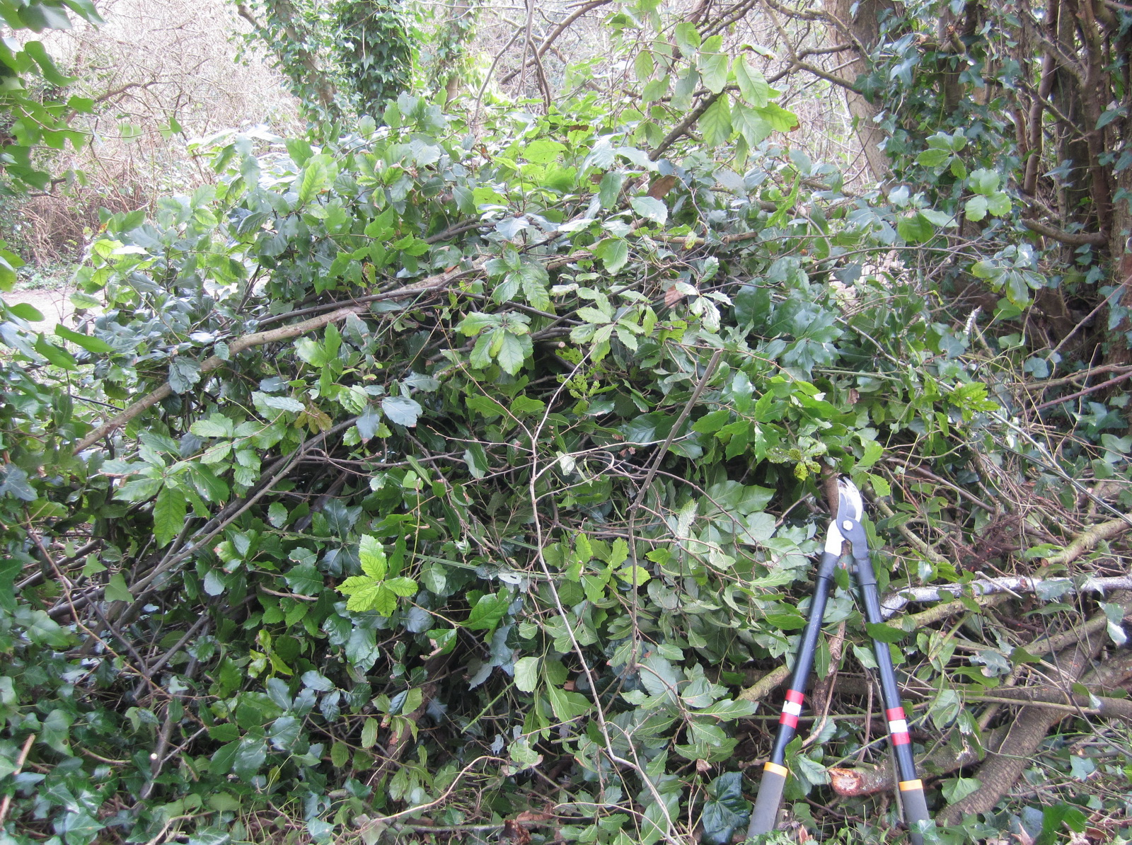 Cut material is used to make habitat piles – here with Holm oak and wild damson