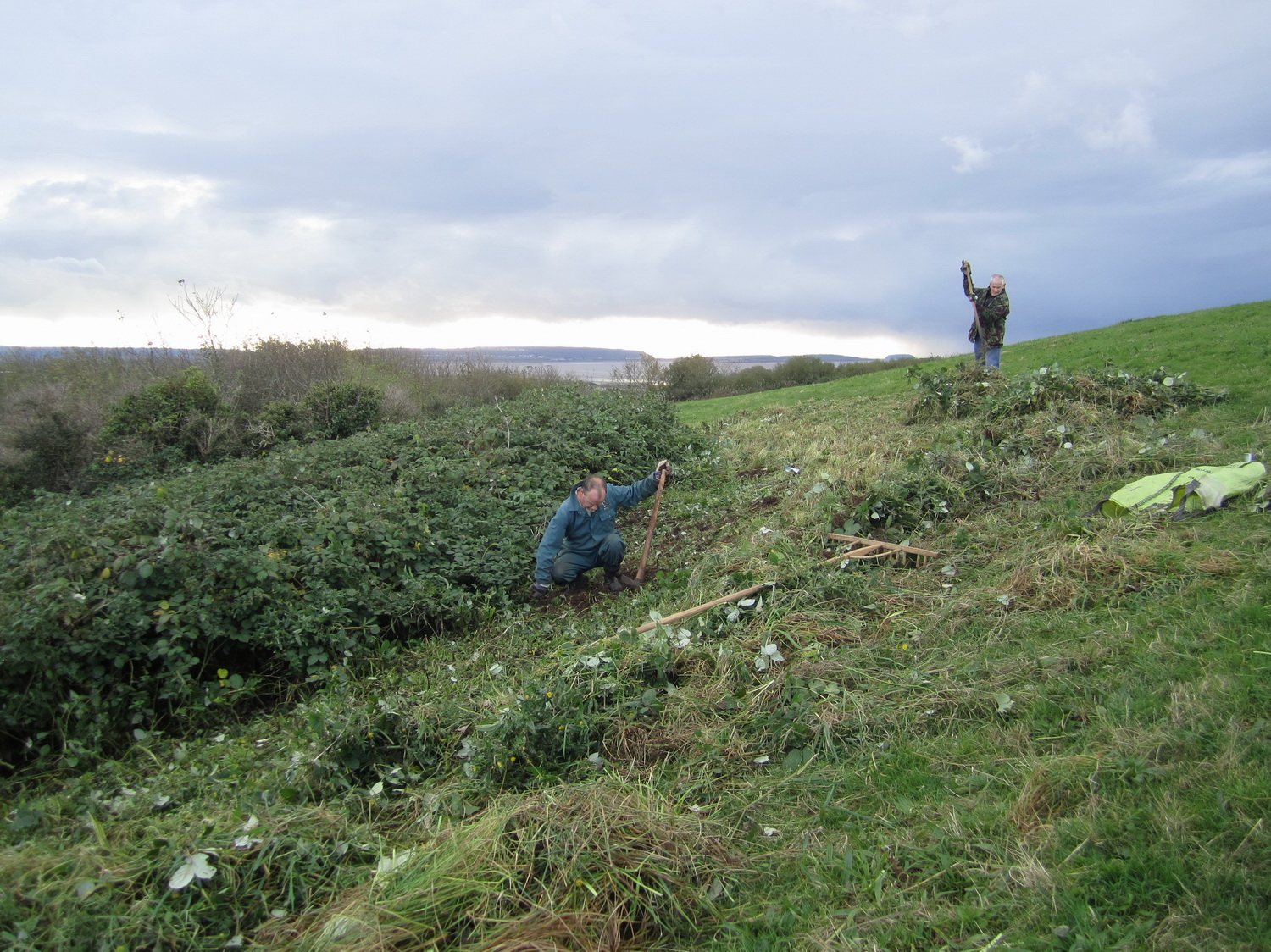 Bramble control on Church Hill: grubbing out roots and raking after scything regrowth