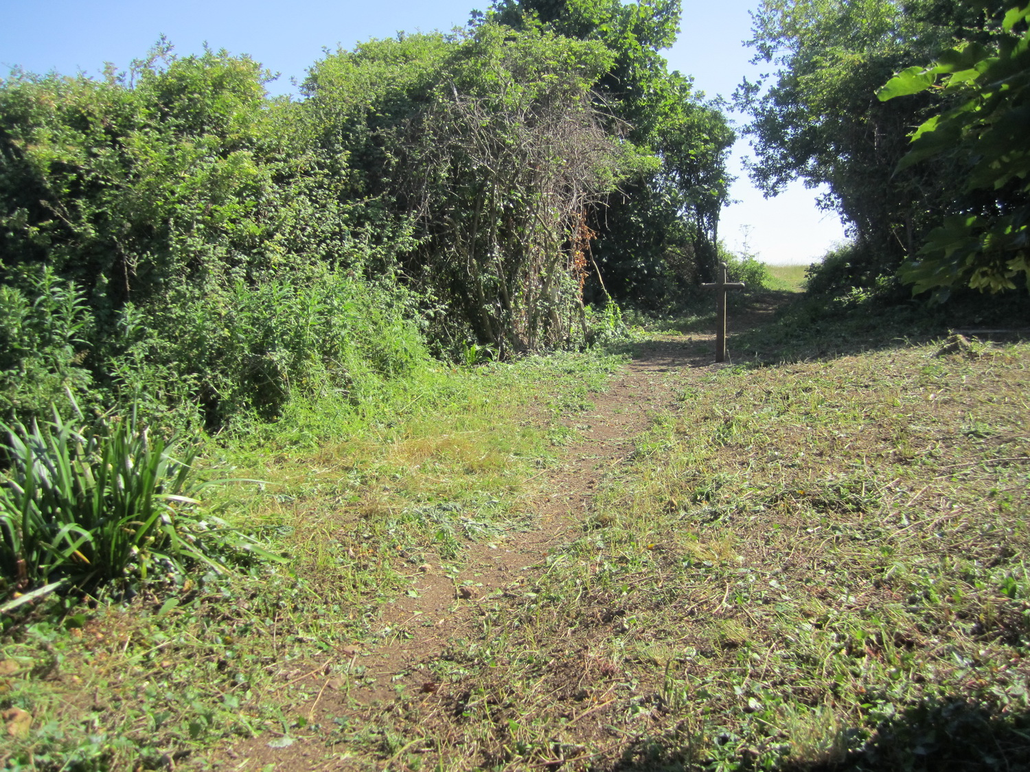 The area near the iron cross bollard above Church Hill zigzag cleared of invasive rose-bay willowherb, creeping thistle and goosegrass by scything