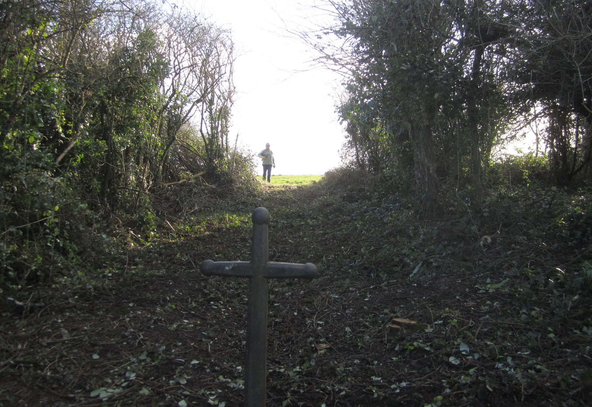 Uncovering the upper end of the zigzag path on Church Hill.The old iron cross bollard (centre of photograph) marks the top end of the zigzag.