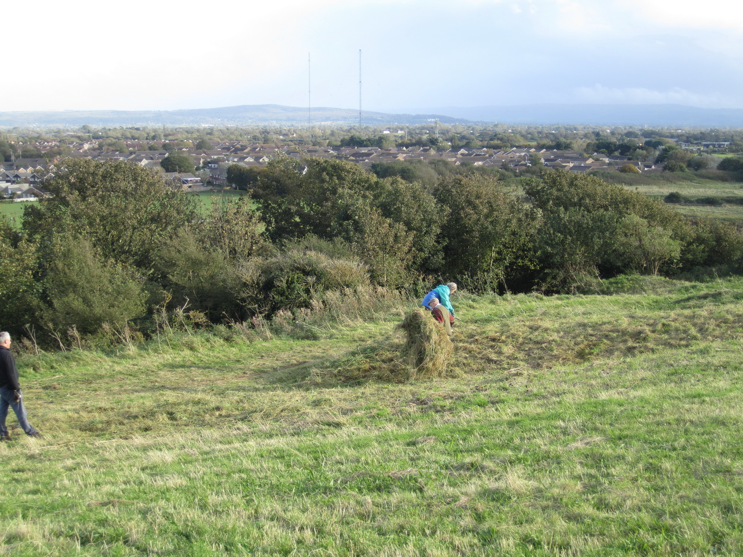 Wain’s Hill north-east corner – a sheltered site with a beautiful view. Rank grass and nettles are scythed and spread out to dry before raking off. Scrub was cleared last year.