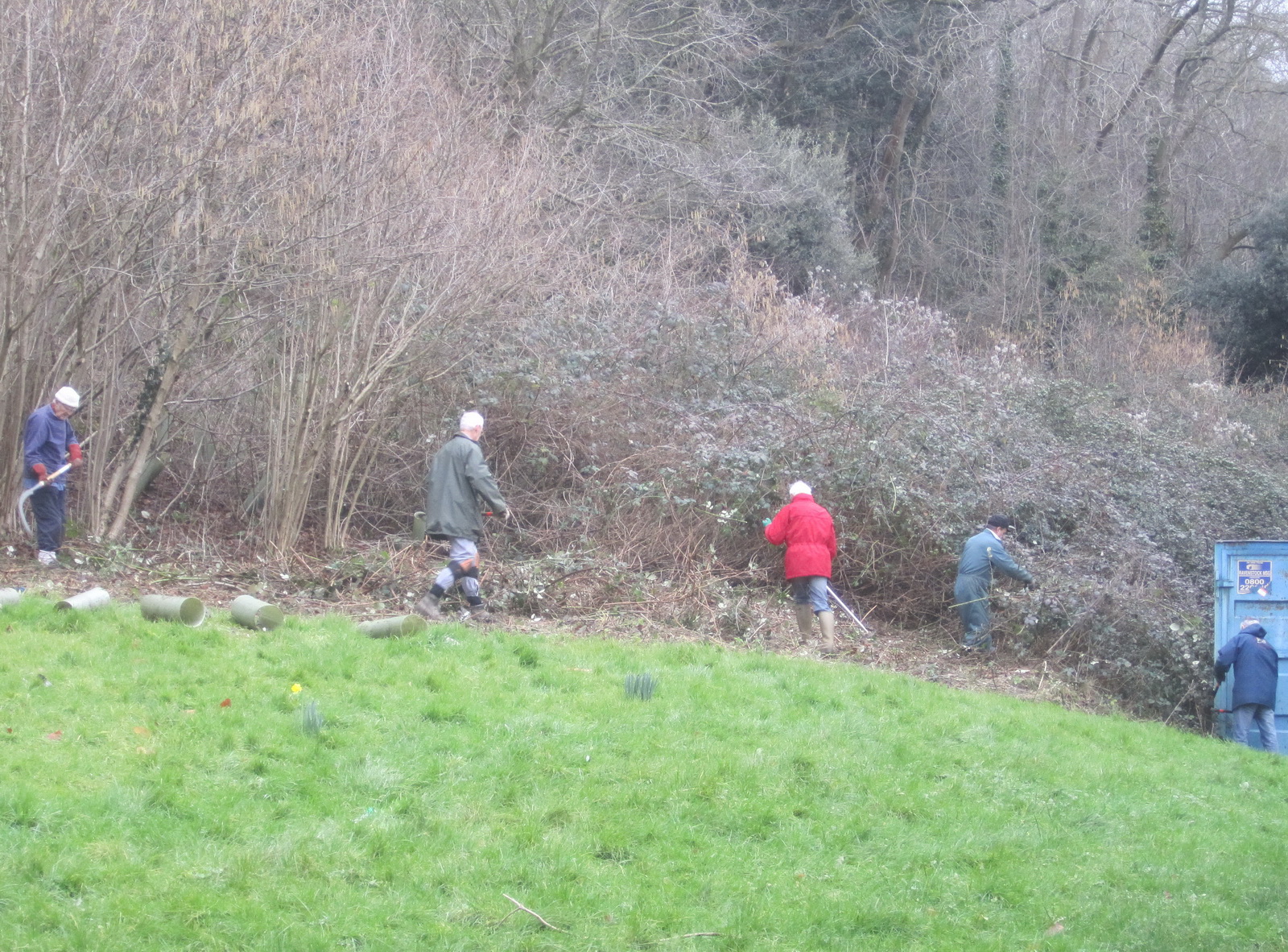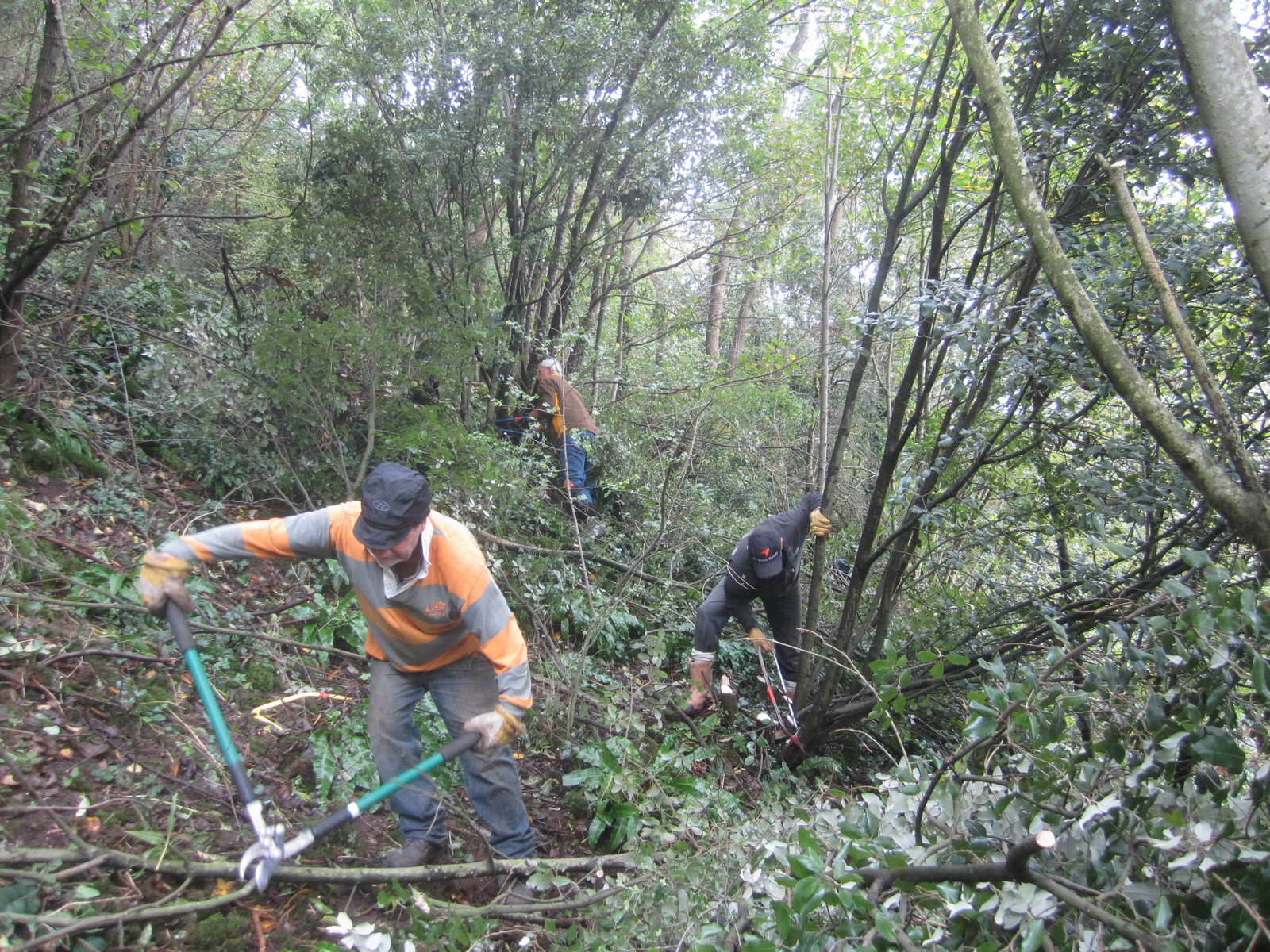 A team of 6 Woodcutters cut out sycamore saplings and non-native Holm oak to allow more sunlight to reach the woodland floor, thereby encouraging native plants and other wildlife to flourish. Cut material is left in heaps creating useful habitat.