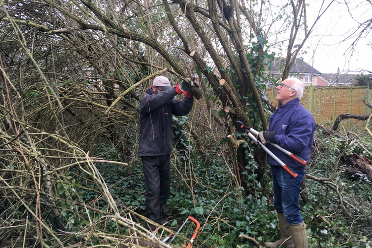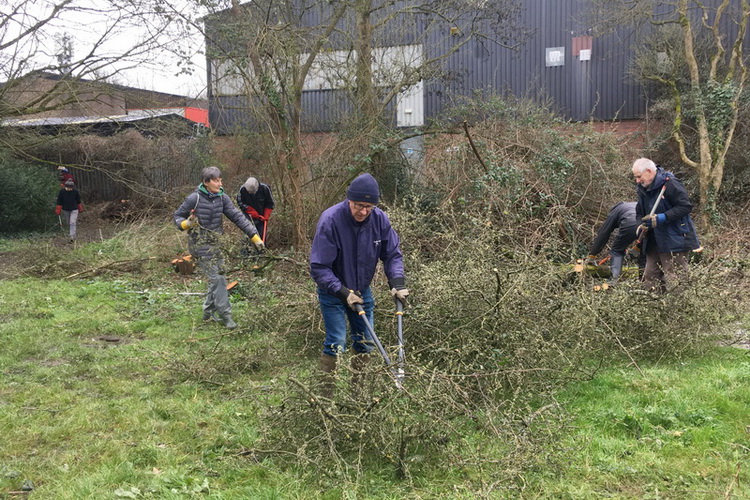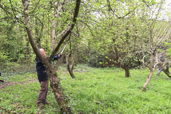 Coppicing some overgrown blackthorn to rejuvenate it and also to create more space for fruit tree planting in the Millennium Community Orchard