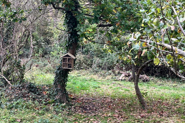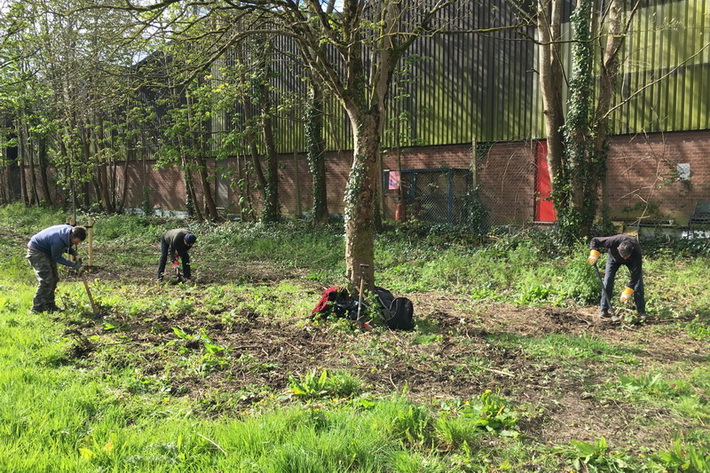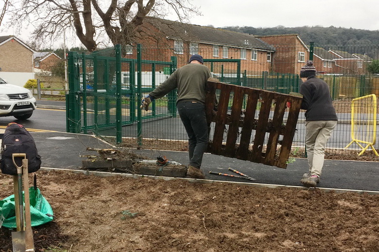 Bug hotels, provided by Willmott Dixon Construction and filled by Baytree School pupils, are put up in the Millenium Community Orchard. A bramble hedge is cut hard back.