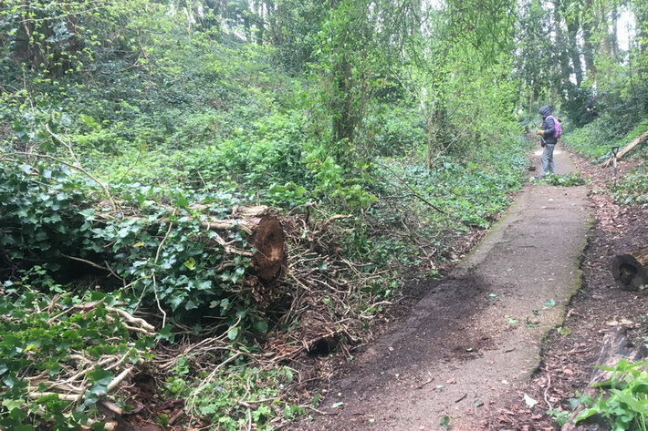 Strawberry Hill woods – a fallen tree trunk is shortened to widen access along the main path. Pulling & cutting back young brambles along another path