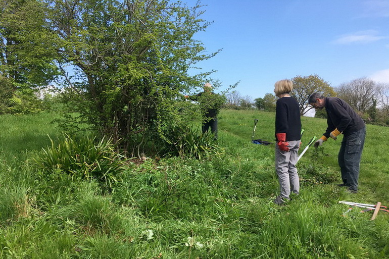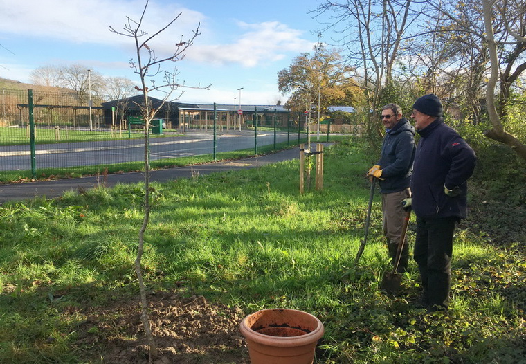 Grubbing out bramble crowns beside Baytree School following scrub clearance by contractors. Remedial pruning of apple trees in the Millenium Community Orchard