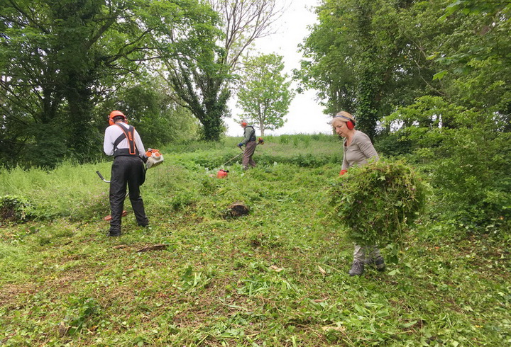 Quinney’s Wood – mowing tree suckers beside the top hedge after pulling brambles. Cutting out tree suckers, mainly blackthorn, in a grassy glade.