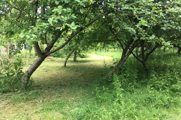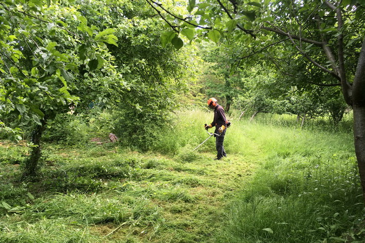 Summer mowing at the Millennium Community Orchard to improve access and reduce competition from over-vigorous or invasive species. Arisings are raked off.