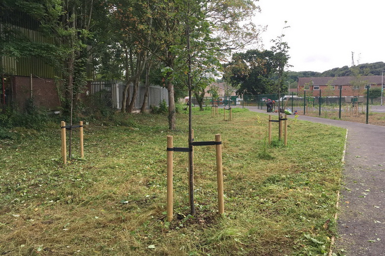 Autumn hedge trimming & cutting back of vegetation along the paths at Marine Lake. Controlling invasive wild cherry saplings encroaching on Church Hill grassland. Planting out a donated oak tree in the Baytree School community area.
