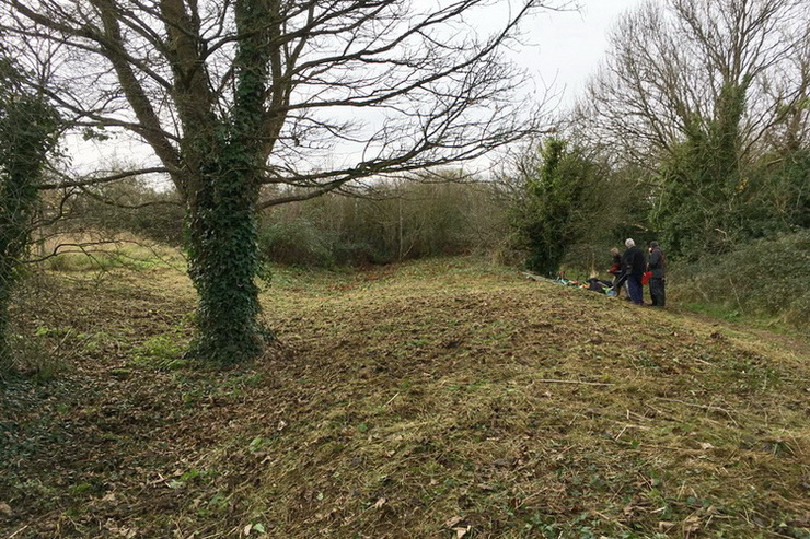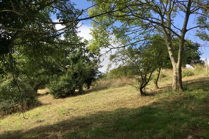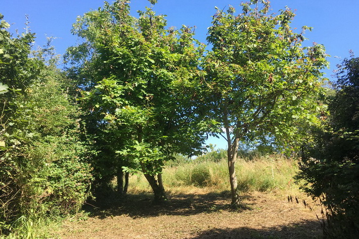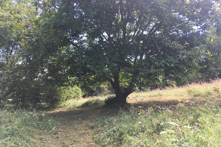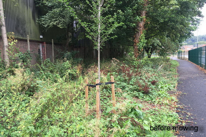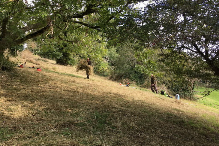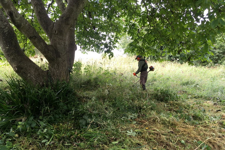 Dial Hill – mowing & raking up rank vegetation to create a wildlife- and visitor-friendly clearing to include two young walnut trees, accessible from the path