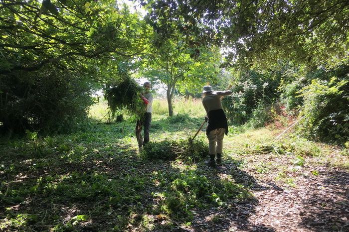 Mowing & raking up under the feature walnut trees on Dial Hill to restore access. Meanwhile, invasive everlasting pea, now flowering, is pulled to control its spread.