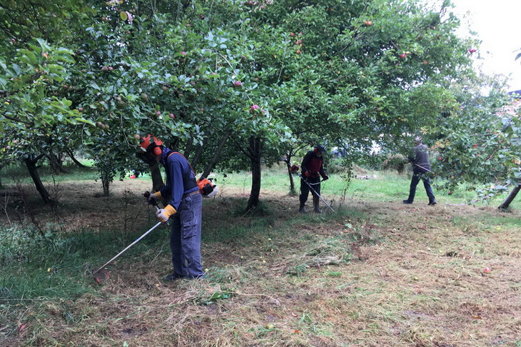 The Millenium Community orchard – mowing before the October cider apple harvest. Brush cutting blackthorn suckers but leaving regrowth of 3 former blackthorn trees
