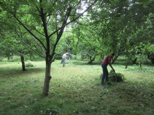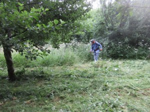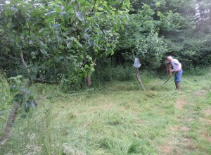 The Community Orchard – cutting areas of rank grass & other vegetation and raking off the arisings to improve the orchard floor. The grass paths are mown to enhance access.