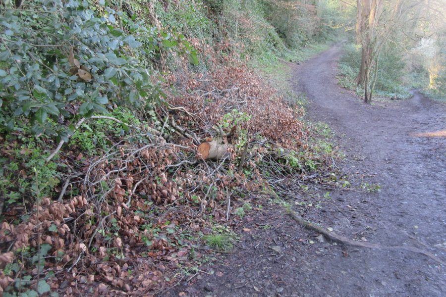 cut Holm oak is dragged up from the path to make habitat piles