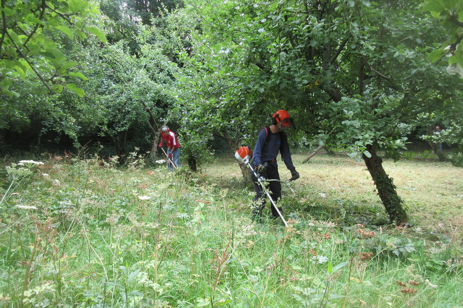 mowing and raking the orchard floor to control rank grasses and other flowering species