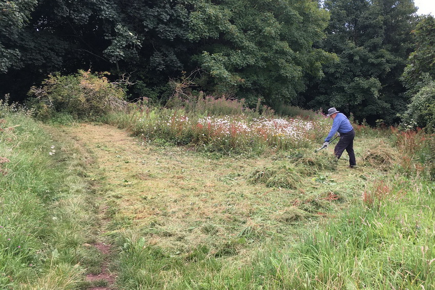 raking up mown vegetation on the northern slope
