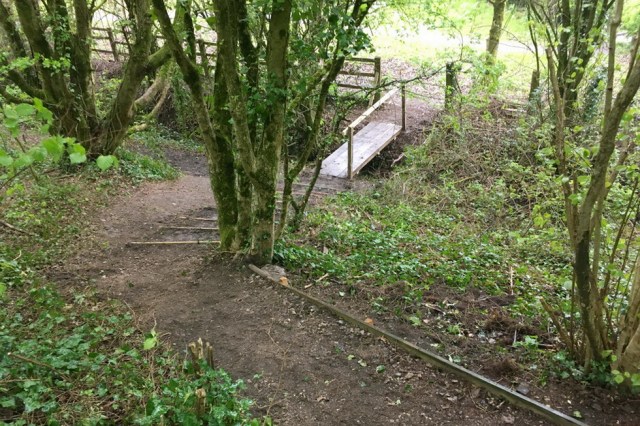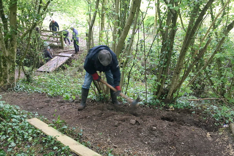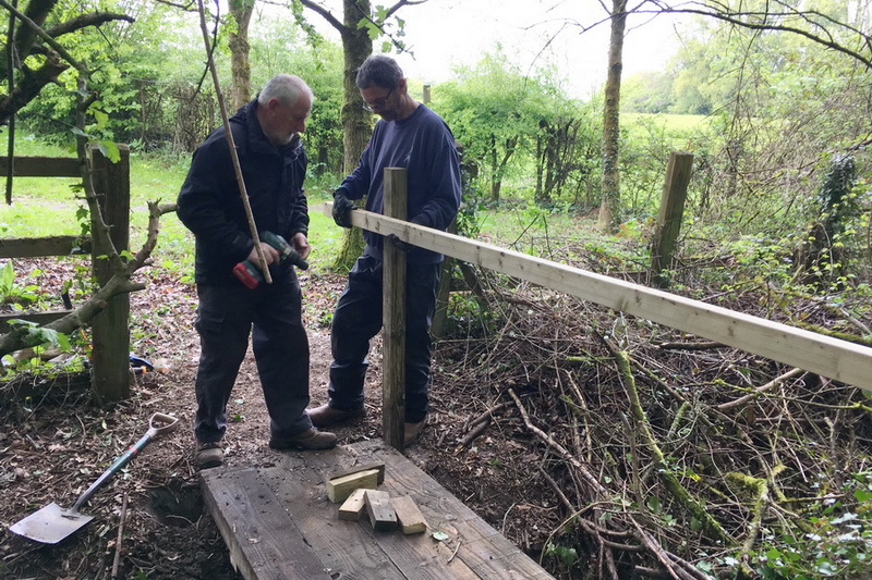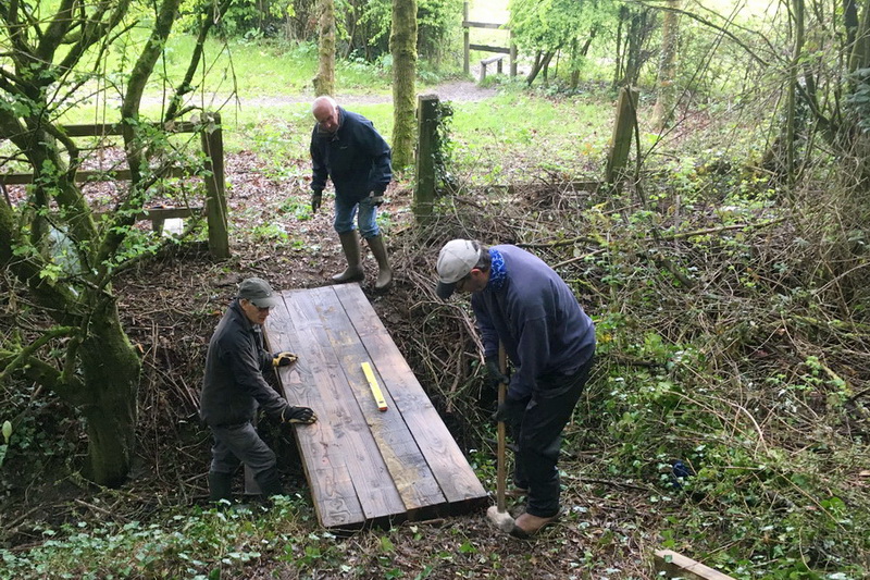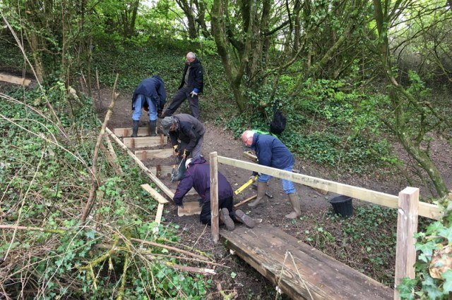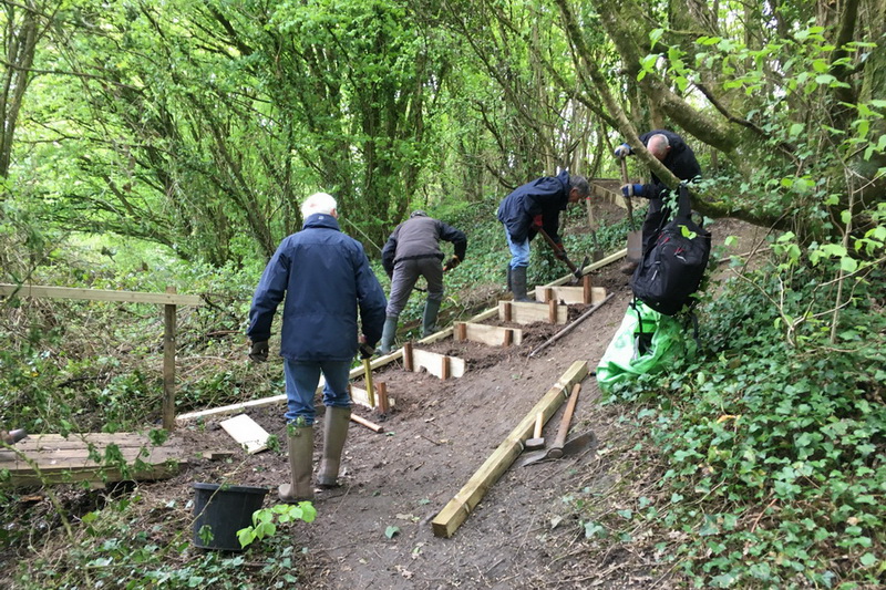 Constructing a bridge & steps and laying revetment boards at Quinney’s Wood. This new access point now connects with the Two Rivers Walk, created by the Land Yeo Friends.