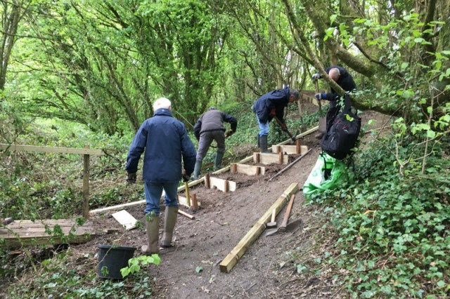 Renovating the woodland steps in Salthouse Wood; revetment is extended to form the bottom step. Clearing back new vegetation to improve access to the lookout & coast path.
