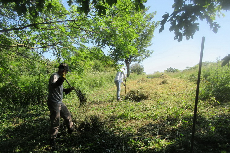 Dial Hill – raking up mown vegetation in the viewing corridor. Mowing and raking up under the two large walnut trees to create a shady playing and picnic area.