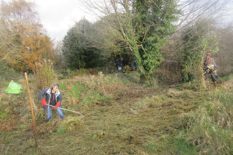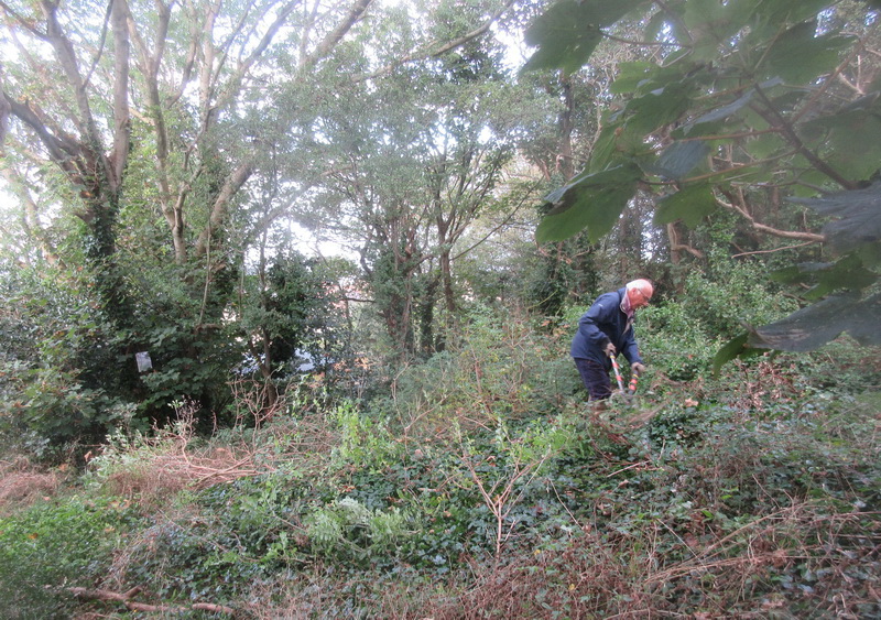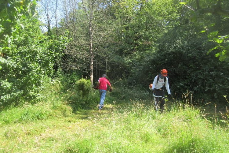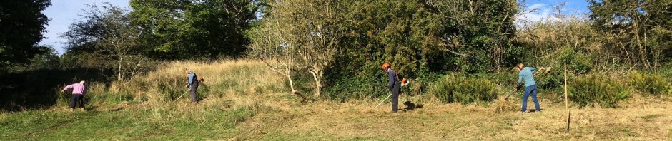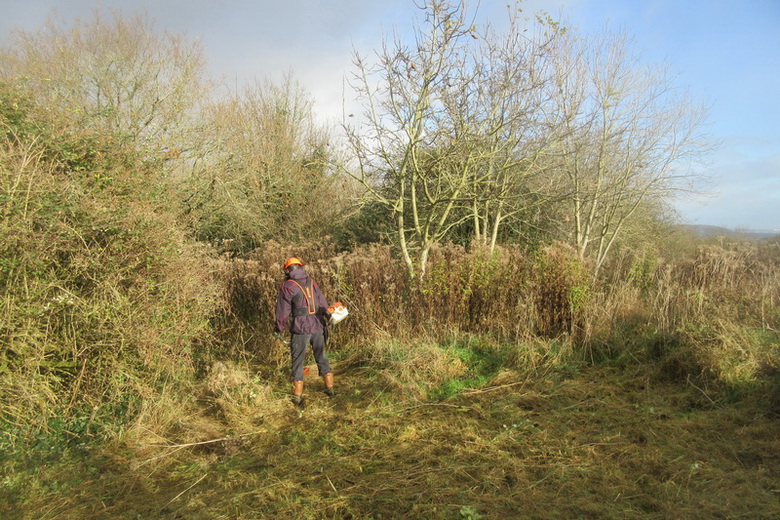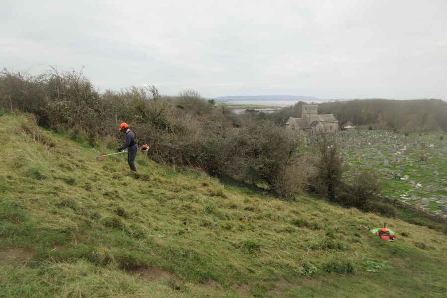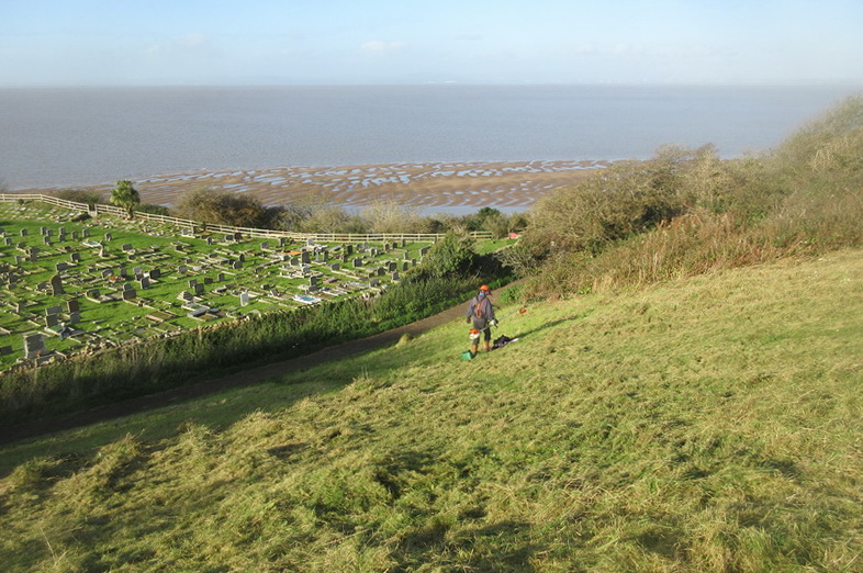 Dial Hill – late summer mowing of grassland areas inaccessible by tractor. Cutting woodland scrub in preparation for the felling of 2 trees to create a view over Clevedon Bay.Thinning out self-set saplings including diseased ash prior to further scrub control.