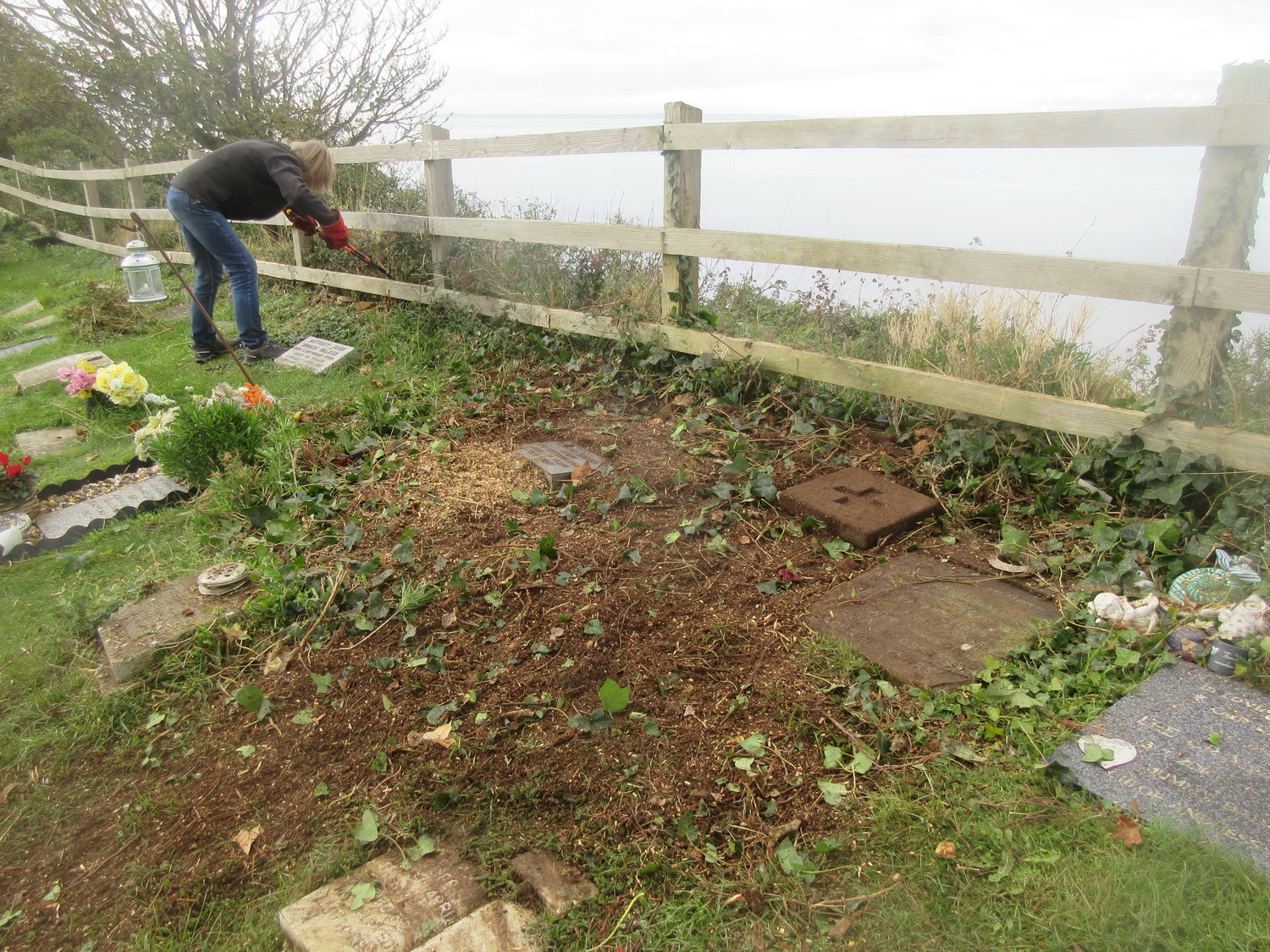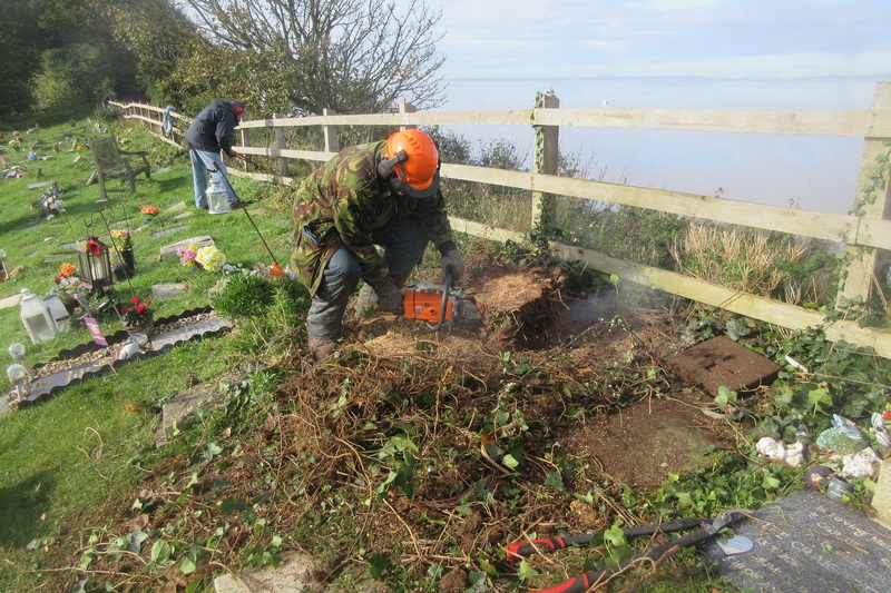 Helping out in St Andew’s churchyard by reducing a large conifer stump and cutting back scrub along the fence. Autumn mowing of a steep slope on Church Hill starts.
