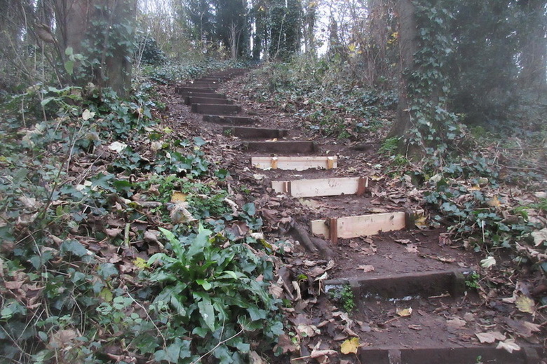 Dial Hill – woodland steps are restored to their full width. New sycamore shoots from tree stumps are cut back and invasive, non-native everlasting pea in grassland is pulled.