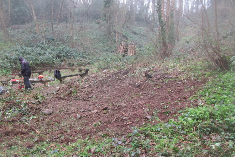 Wain’s Hill rampart slope (Poets’ Walk) has been strimmed and partly raked by contractor Green Mantle. The Woodcutters take the arisings into the woodland for habitat piles. Sycamore shoots are cut out along the woodland edge to allow in more sunlight.