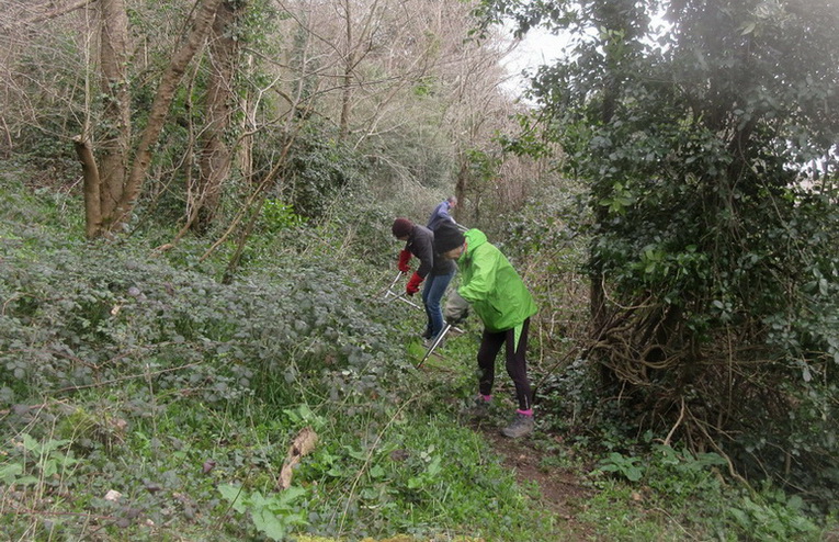 Clevedon School – the neglected seating area is weeded to prepare it for use again by students as an outdoor teaching area. Brambles and nettles are pulled from the surrounding newly tree-planted area and the woodland trail is reopened by clearing new bramble and nettle shoots.