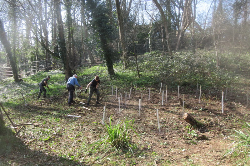 After more bramble grubbing, the Woodcutters help Clevedon School students to plant trees donated by the Woodland Trust.