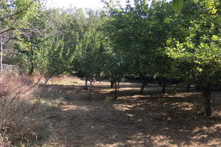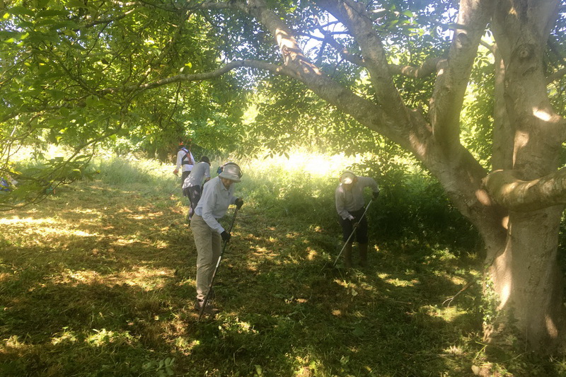 Mowing under apple trees in the Millennium Orchard to facilitate harvesting – our first chance to work on site since the start of the building of a new school next door.