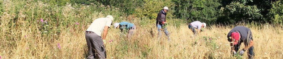 Dial Hill – new or re-grown ragwort plants are forked out every July before they can set seed. The population has decreased markedly since the first big ragwort pull in 2014. Invasive everlasting pea has to be pulled repeatedly throughout the spring and summer.