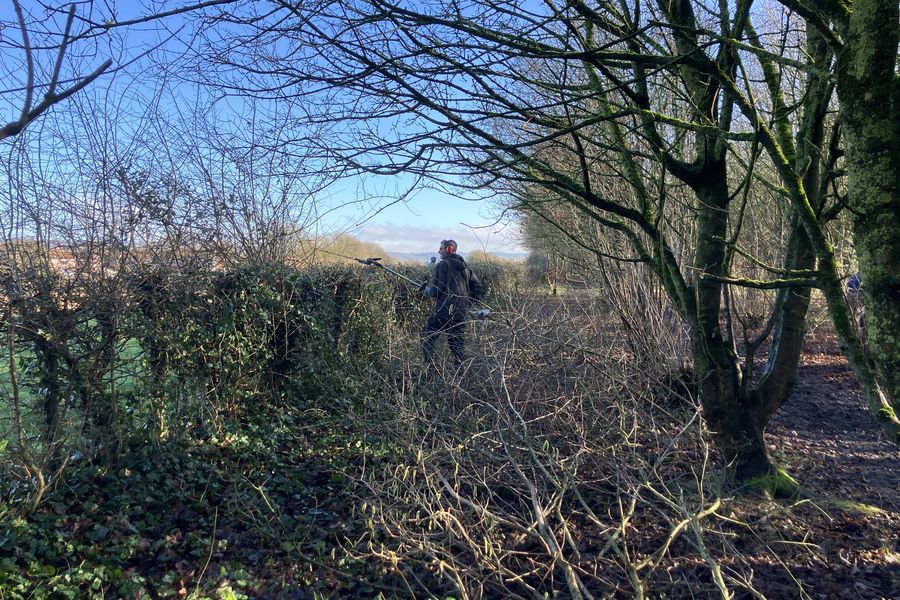 Quinney’s Wood – cutting the top hedge and creating a ‘dead hedge’ with the arisings